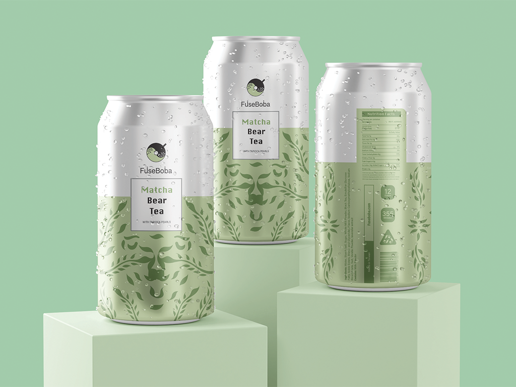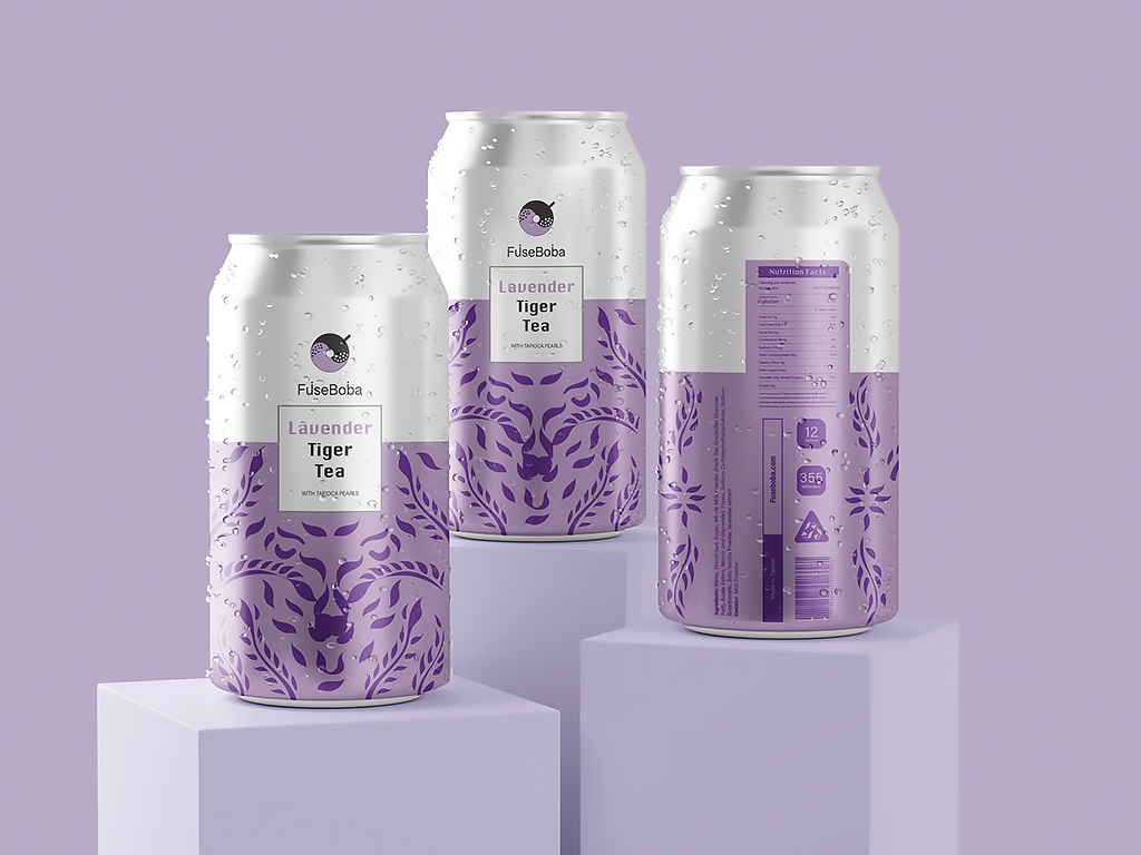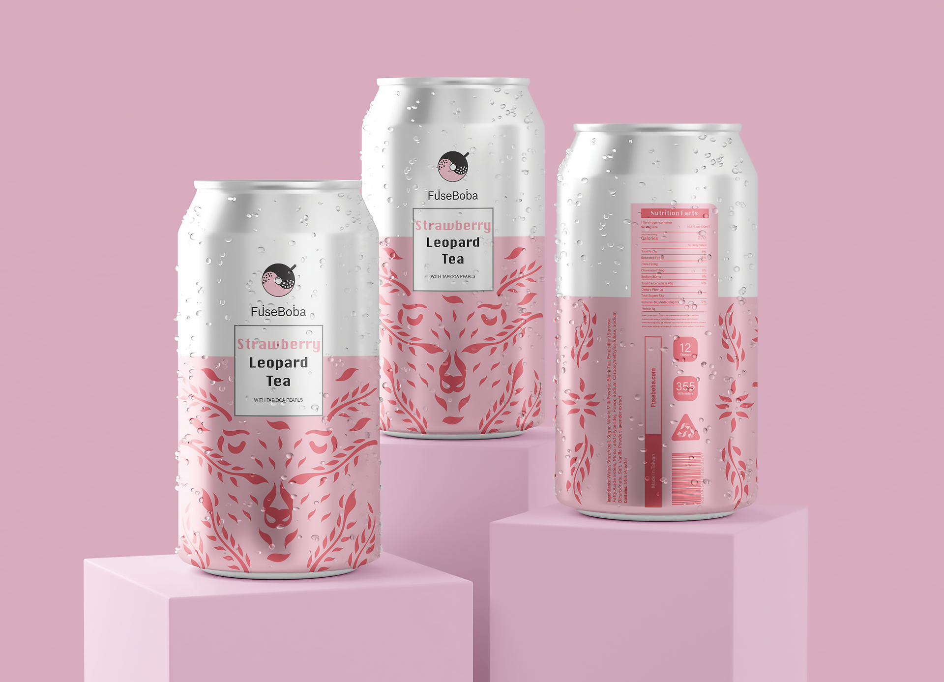 Logo and packaging design for Fuse Boba, inspired by the yin-yang symbol to represent the balance of two flavors coming together. Each illustration fuses an animal face with tea leaves, creating unique designs for every can while reinforcing the brand’s theme of harmony and fusion