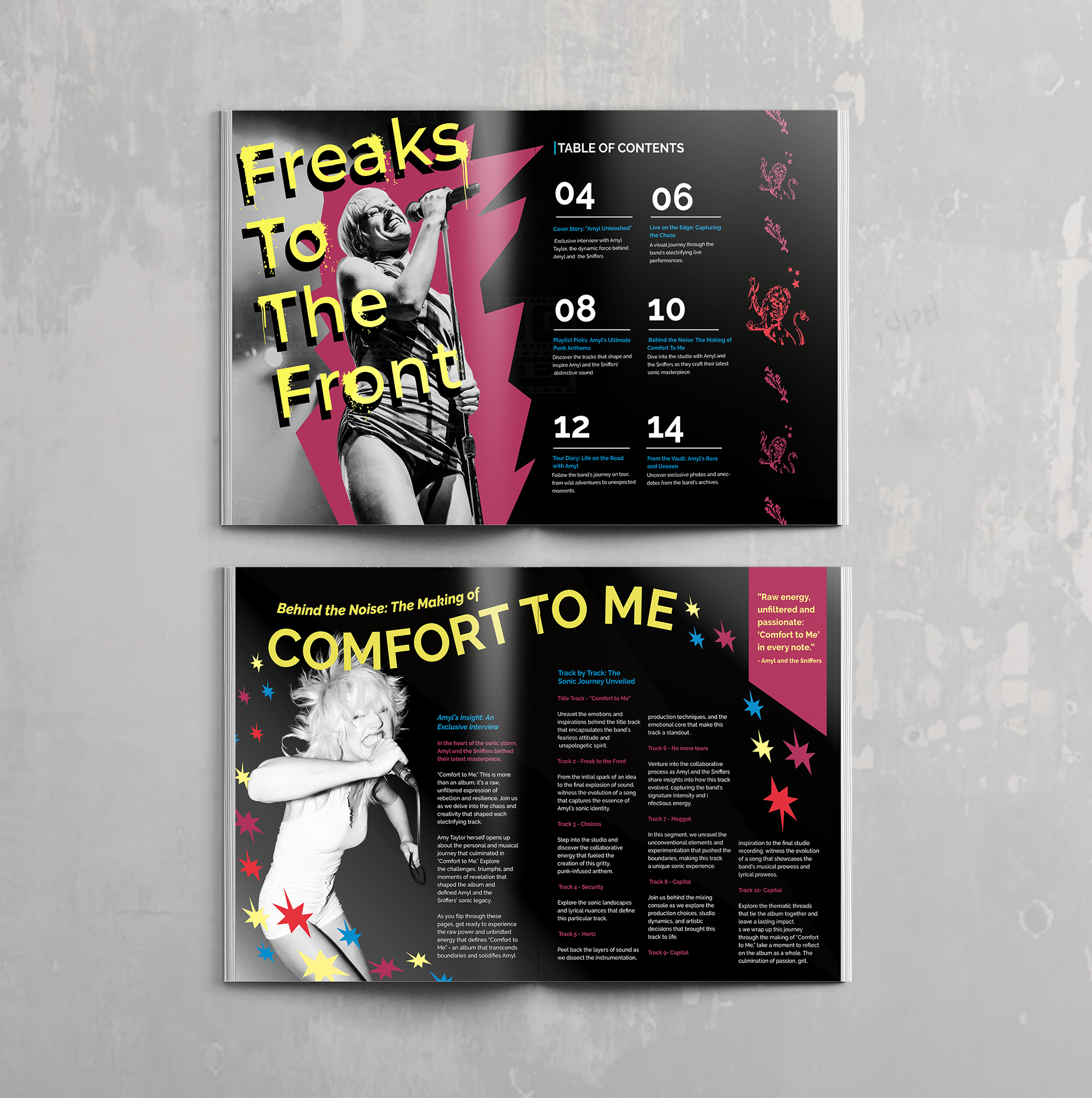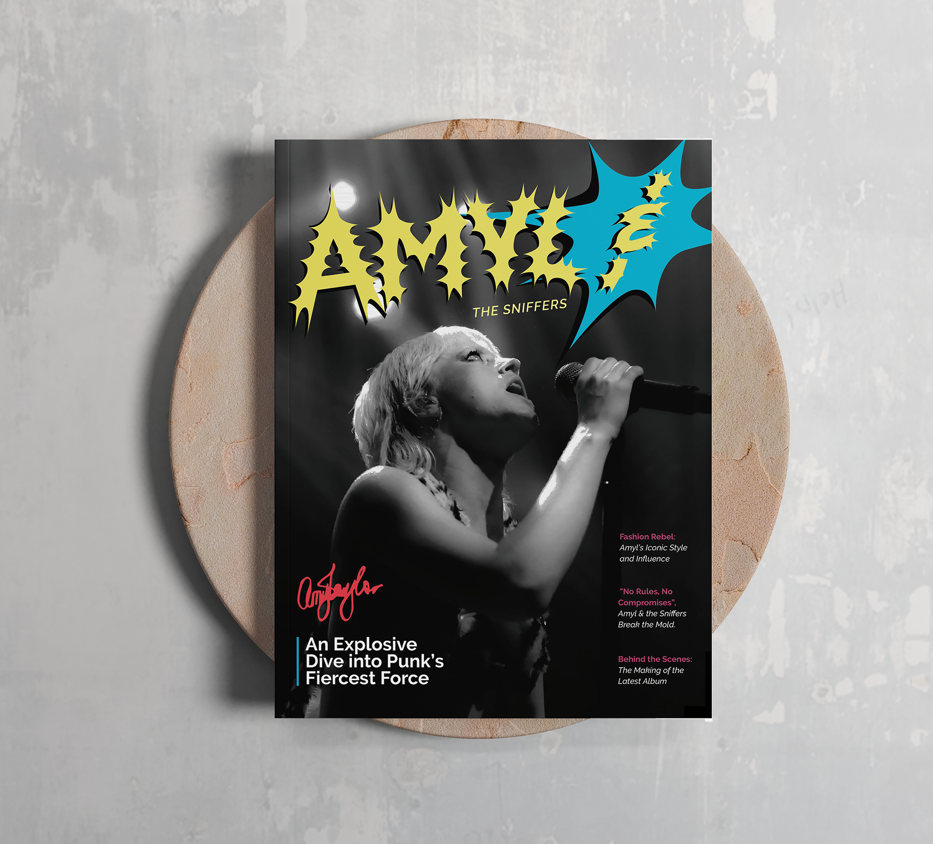 Magazine design inspired by punk rock band Amyl and the Sniffers, drawing from their black-and-white album covers and their latest release.
