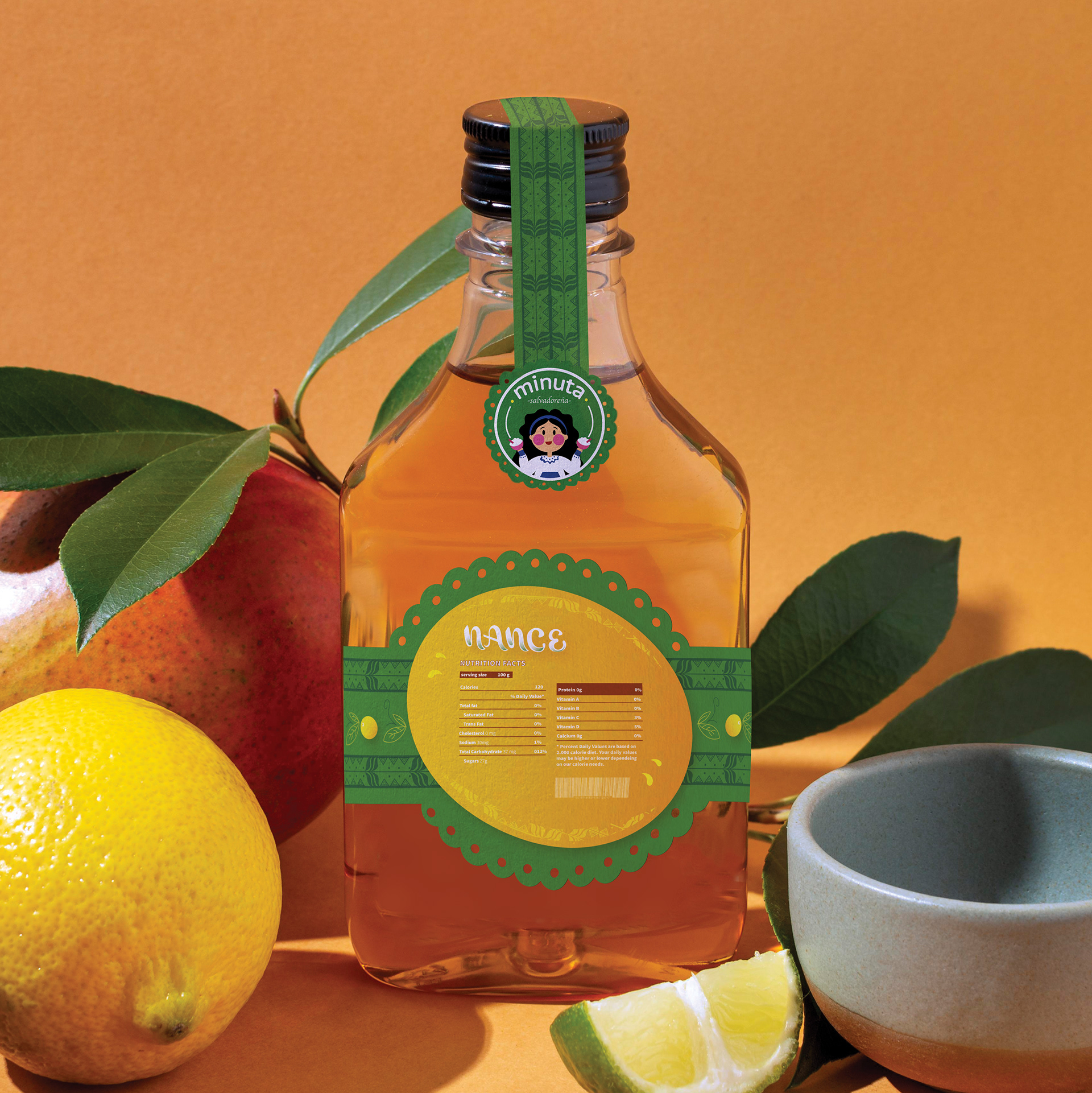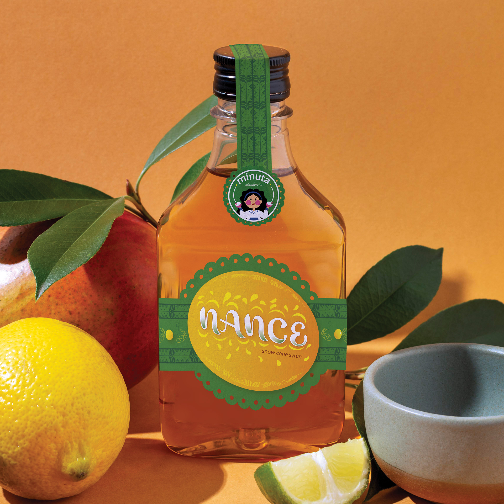 Bottle design for a nance-flavored shaved ice. Nance, a fruit native to Central America and especially popular in El Salvador, inspired a design that highlights its cultural roots while appealing to a wider audience.